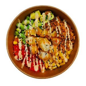 Gamberoni in tempura, avocado, edamame, germogli di soia, pomodoro, mais, erba cipollina, salsa pink, semi di sesamo.